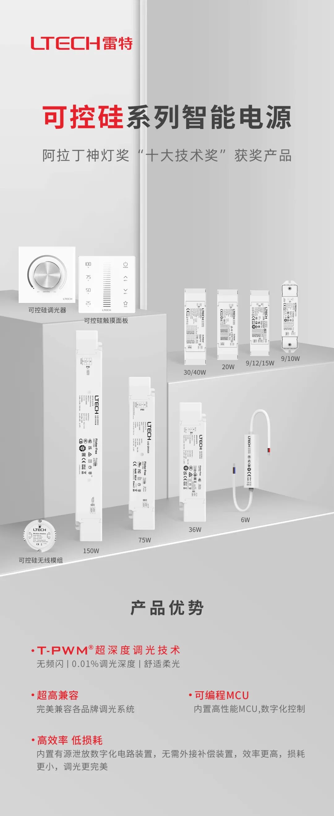 可控硅技术无需信号线,不用改变原有线路的简便性,一直深受工程方欢迎。雷特可控硅调光电源内置“人工智能”算法以及高性能MCU,具有完全自我分析学习能力,并获得2018年阿拉丁神灯奖的“十大技术奖“,媲美数字信号一样的精准的调光技术,调光效果与兼容性接近极致。