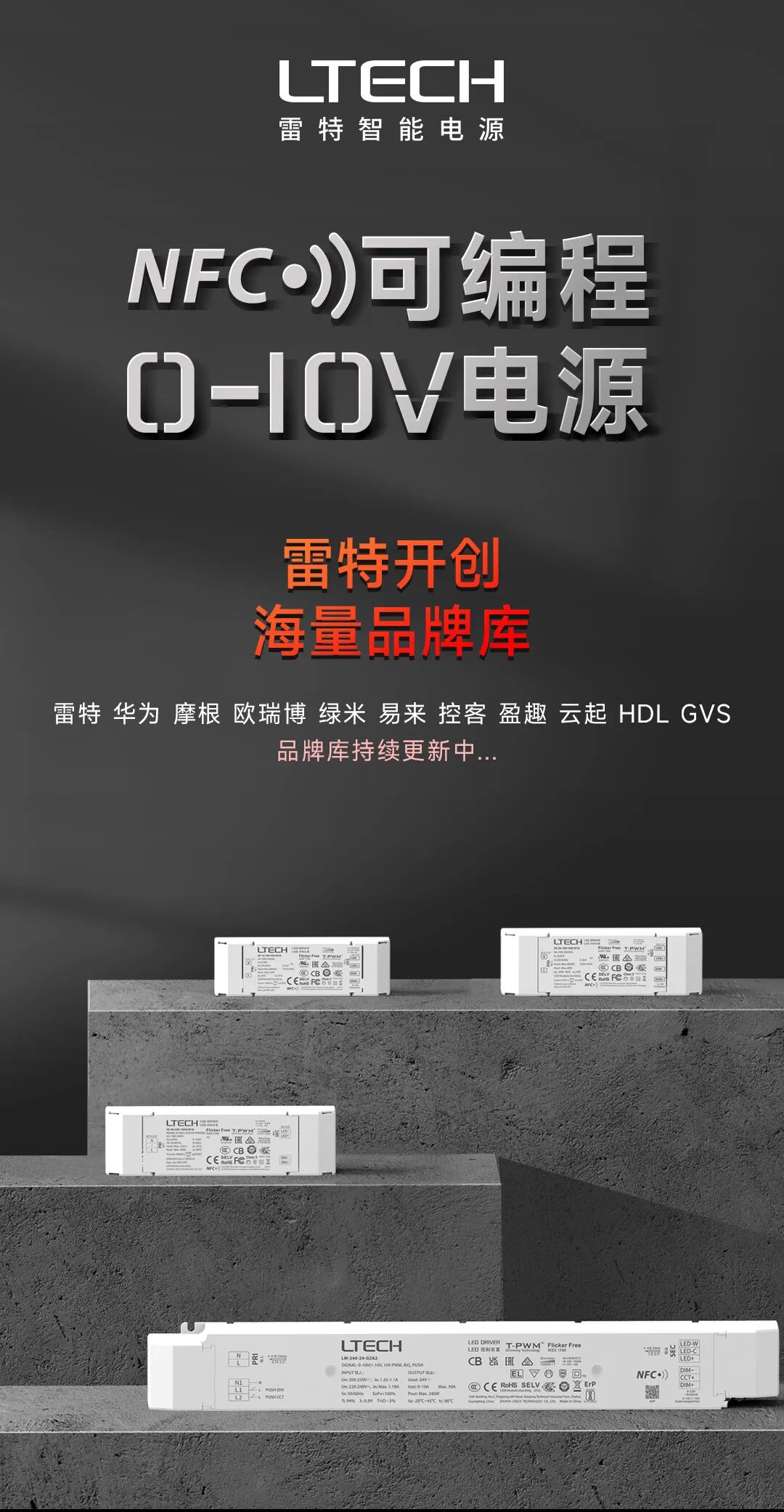 雷特0-10V超低功耗接口设计,同一回路带载能数量高达200台电源,高于同类产品的20倍;更具备0-10V/1-10V输入自动切换功能,大大提高工程效率;具备NFC近场编程功能,无需通电即可通过手机一键编程测试;打造有海量品牌库,精准度媲美DALI数字调光。