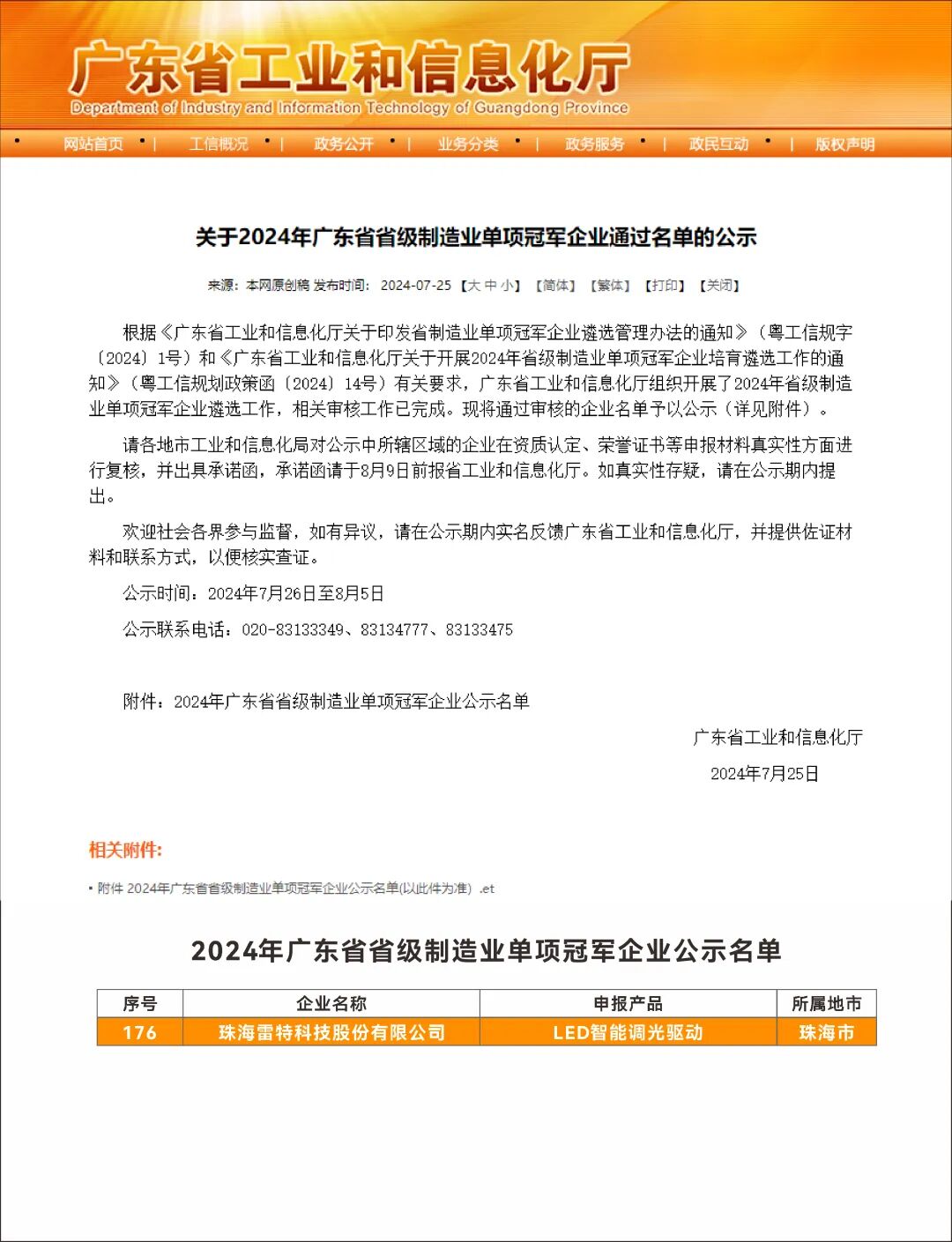 近日,雷特再收获殊荣——入选由广东省工业和信息化厅评定的“2024年广东省省级制造业单项冠军企业”,其中其智能电源系列产品(LED智能调光驱动)被列为“单项冠军产品”!