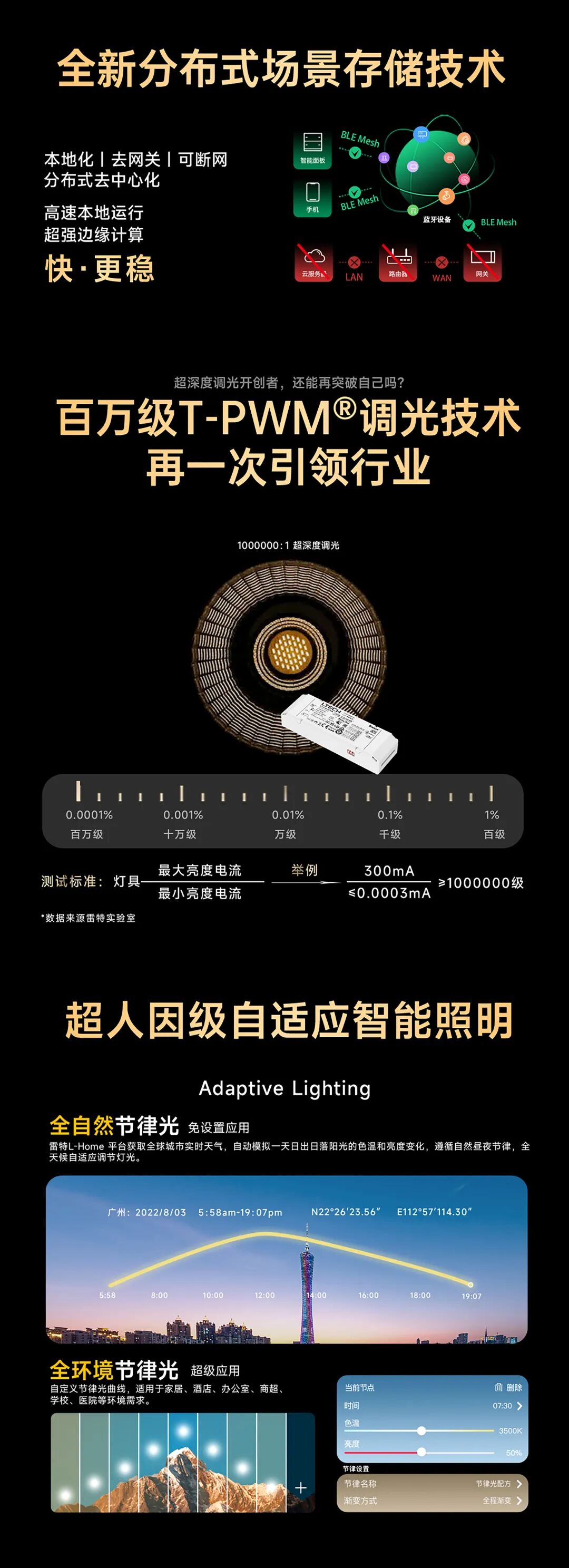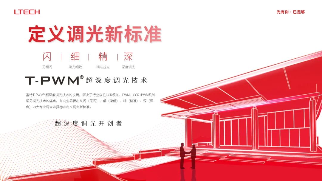 雷特T-PWM®超深度调光技术的发明,解决了行业以往CCR模拟、PWM、CCR+PWM几种常见调光技术的痛点,并向业界提出从闪(无闪)、细(柔细)、精(精准)、深(深度)四大专业调光选择标准定义调光新标准。雷特更是业内调光电源率先实现万分之一调光深度的品牌;不断突破自我,蓝牙5.0智能电源实现T-PWM®百万级超深度调光,满足用户在不同场景下的灯光使用需求。