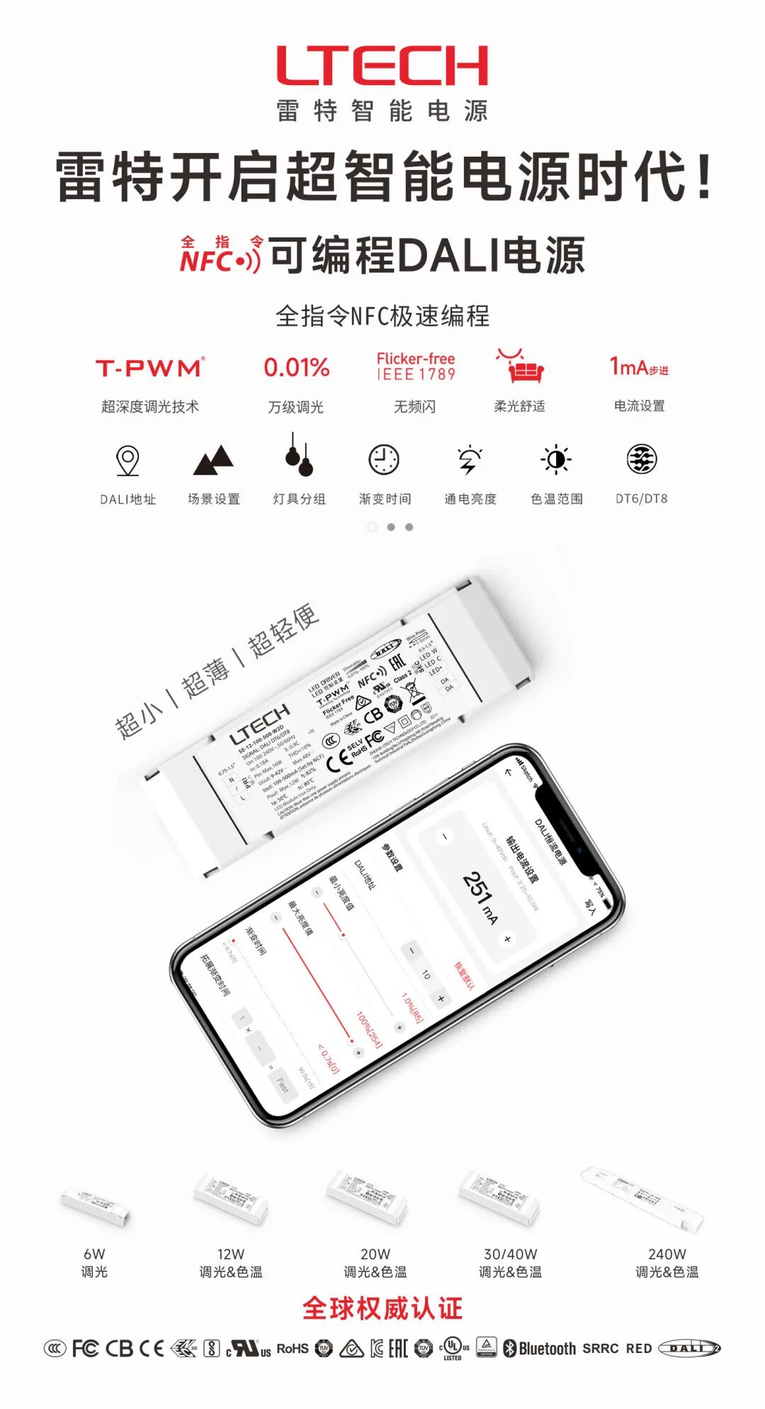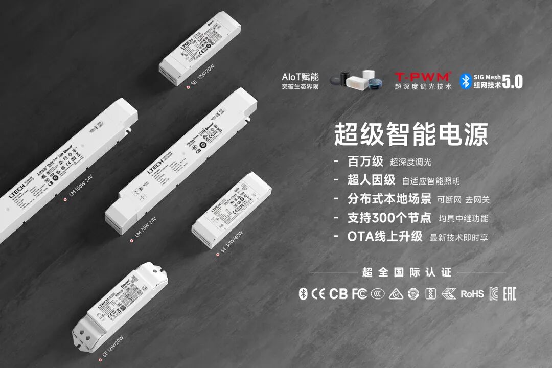 雷特蓝牙5.0 SIG Mesh智能电源通过蓝牙联盟官方制定SIG Mesh标准认证;更通过了超全国际认证;同时,其自带雷特大三黑科技:T-PWM®百万级超深度调光、全新分布式场景存储技术、超人因自适应智能照明,为各类项目打造健康、舒适的品质好光。